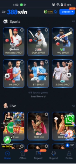 - Sports Betting: For sports fanatics, 388WIN is a paradise. It allows you to place bets on a huge variety of sports, with a special focus on cricket. You can bet on international matches, domestic leagues like the PSL, and even live games as they happen.
